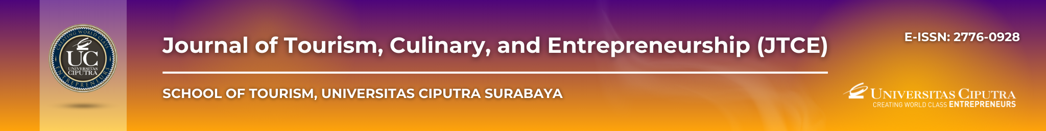 Journal of Tourism, Culinary, and Entrepreneurship (JTCE) (e-ISSN: 2776-0928) is a peer-reviewed publication managed by the School of Tourism at Universitas Ciputra Surabaya, Indonesia. It serves as a platform for scholars and industry professionals to exchange and expand their knowledge in tourism, hospitality, food science, and entrepreneurship. The journal provides an opportunity for researchers to publish their academic work biannually, in April and October.