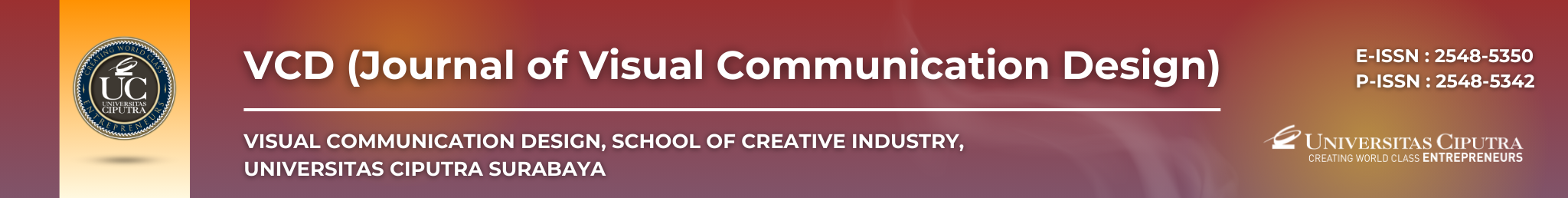 (VCD) Journal of Visual Communication Design (e-ISSN: 2548-5350; p-ISSN: 2548-5342) is a peer-reviewed academic journal published twice a year by the Visual Communication Design Study Program at Universitas Ciputra Surabaya.
