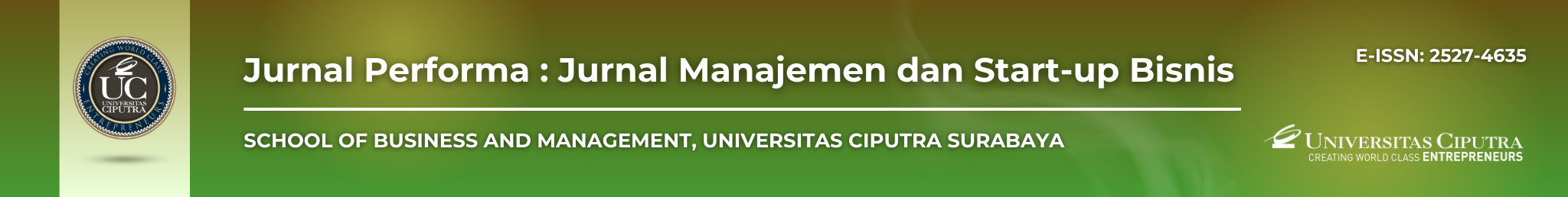 Jurnal Performa: Jurnal Manajemen dan Start-up Bisnis (e-ISSN: 2527-4635) is managed professionally and independently by the School of Business and Management, Universitas Ciputra Surabaya since 2016. This journal publishes three issues in a year in April and August. The aim of this journal is to enhance a better understanding of research-based business management science among academics and researchers. Thus, these researches will give positive contribution and influence to the world of business management science and entrepreneurship.
